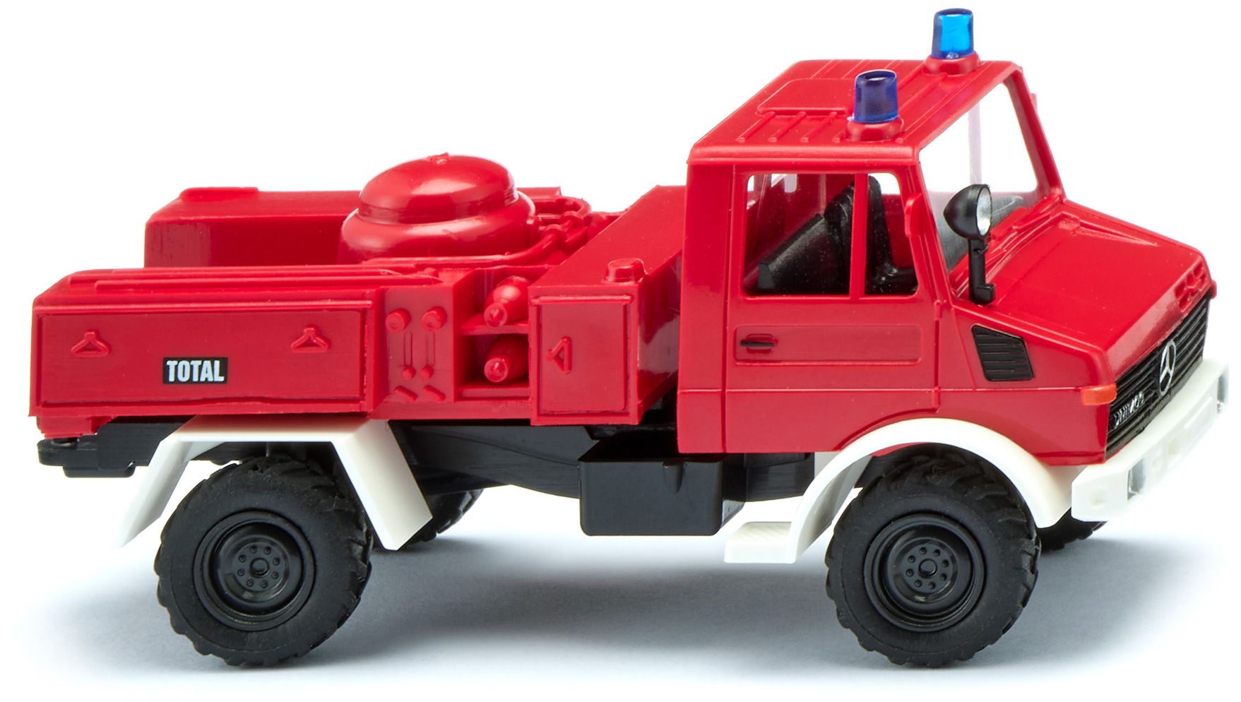 Fahrerhaus karminrot, Inneneinrichtung schwarz. Fahrgestell mit Kardanwelle, Felgen sowie Suchscheinwerfer schwarz. Dach mit zwei blautransparenten Warnlichtern. Vordere Stoßstange mit Kotflügeln sowie hintere Kotflügel weiß. Pulverlöschaufbau karminrot. Vorne silberne Bedruckung mit Mercedes-Benz-Stern und Unimog-Schriftzug. Kühlergrill schwarz bedruckt. Blinker verkehrsorange. Lufteinlass und Türgriffe schwarz. Rücklichter braunrot. Seitlich weißer Total-Schriftzug auf schwarzer Fläche am Aufbau.