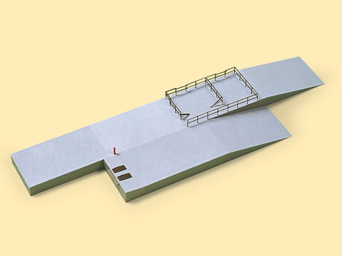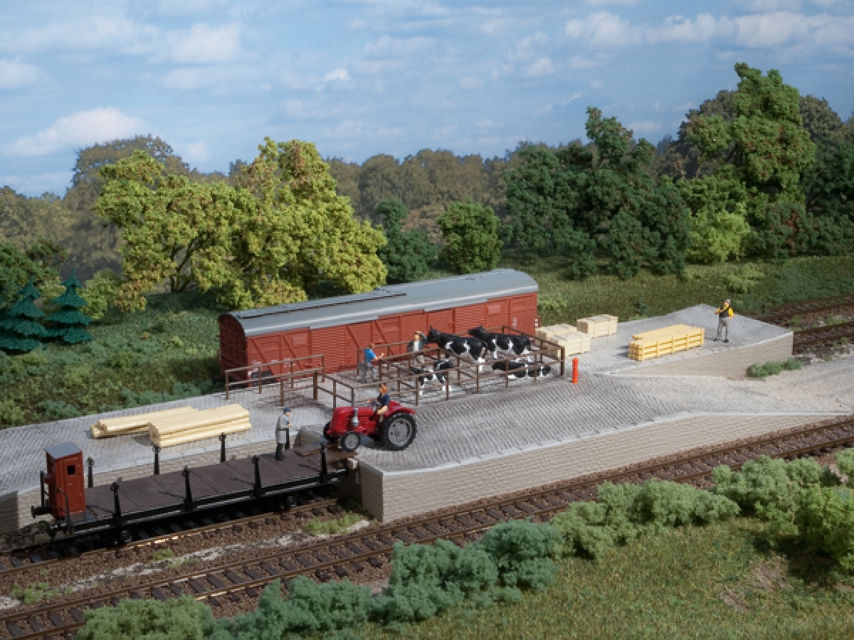 Für Beladegut aller Art. Mit drei rechteckigen Rampen je 119 x 70 x 18 mm, einem Kopframpenteil 70 x 26 mm und zwei Auffahrten 119 x 70 mm in Pflastersteinstruktur. Zur Viehverladung gehören der Stahlrohrzaun und der Hydrant - Wasseranschluss zur Reinigung des Viehgatters. Für alle H0-Gleissysteme geeignet.