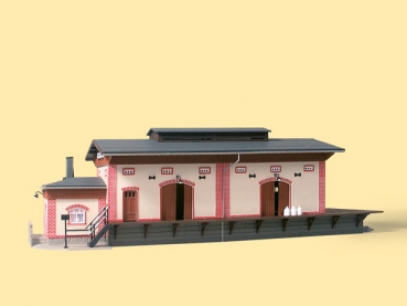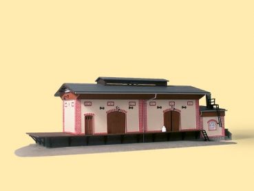 Ziegelkanten verzieren die geputzten Wände. Mit Rampen an der Gleis- und Straßen- sowie an einer Giebelseite. Spur HO Anbau am anderen Giebel. Lampen und Säcke liegen bei, Türen zum Öffnen. 316 x 125 x 92 mm.
