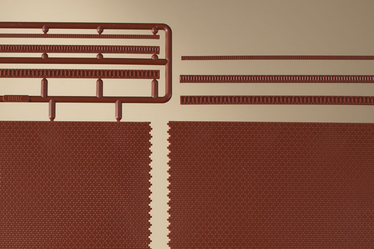 Endlich können auch Ziegelbauten individuell gestaltet werden! Exakter Kreuzverband mit Verzahnung für Endlosmauern. Spur HO Mit 3 verschiedenen Zahnfriesvarianten bzw. Verzierungen. Je 210 x 65 mm.