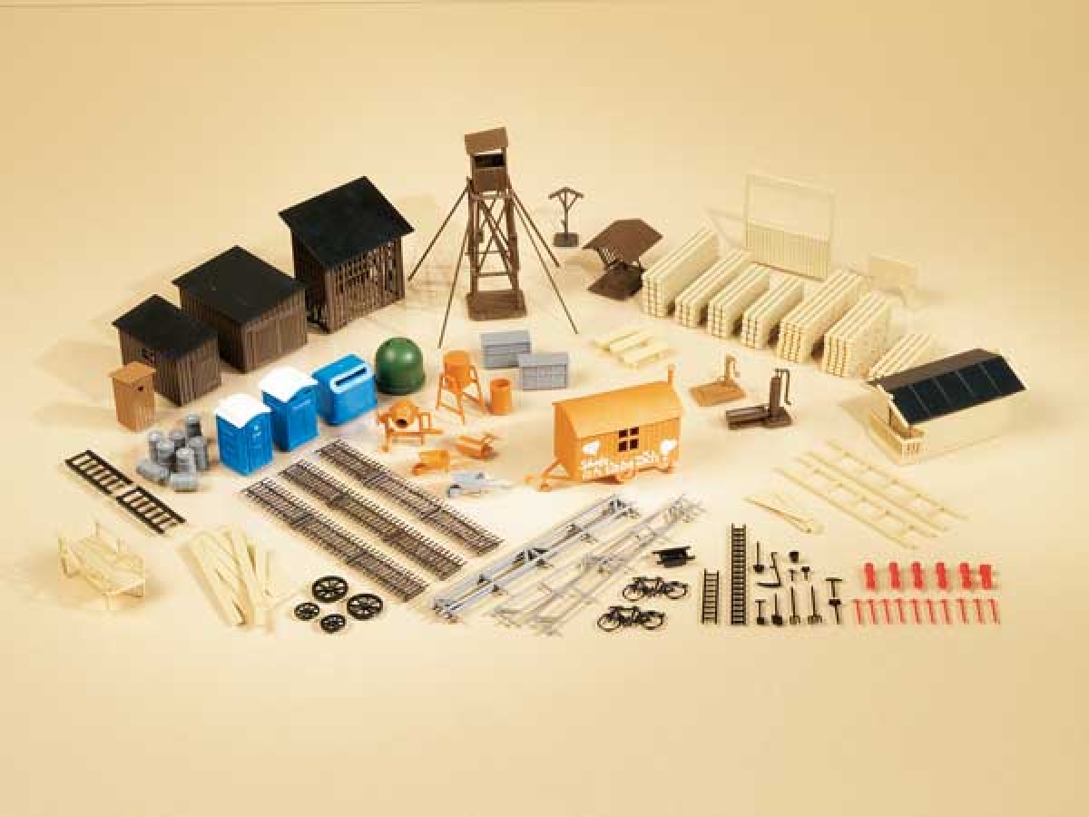 Schatzkiste Mit diesen verschiedenen Kleinteilen lässt sich viel Vorbildnähe auf die Anlage zaubern. Dafür ist auch immer noch Platz! Außerdem könnte der Bauwagen hilfreich bei Beschwerden wegen "zu viel Zeit fürs Hobby" sein.
