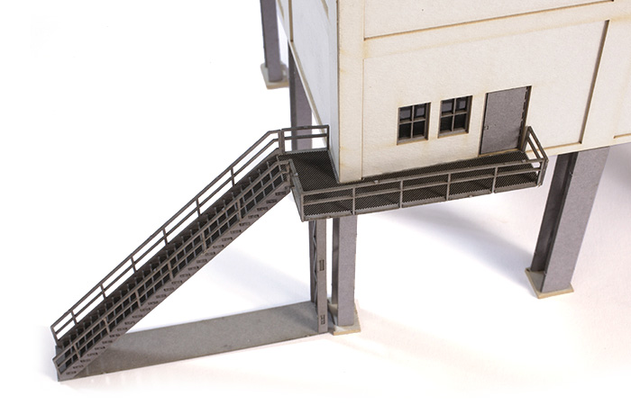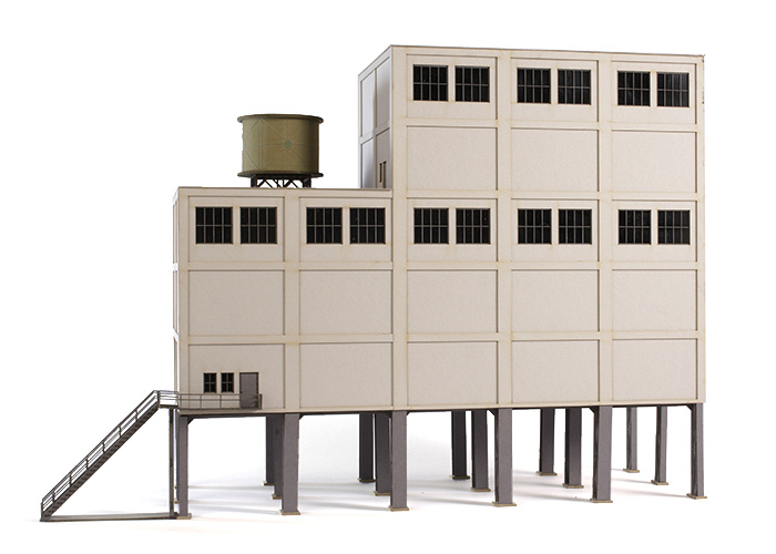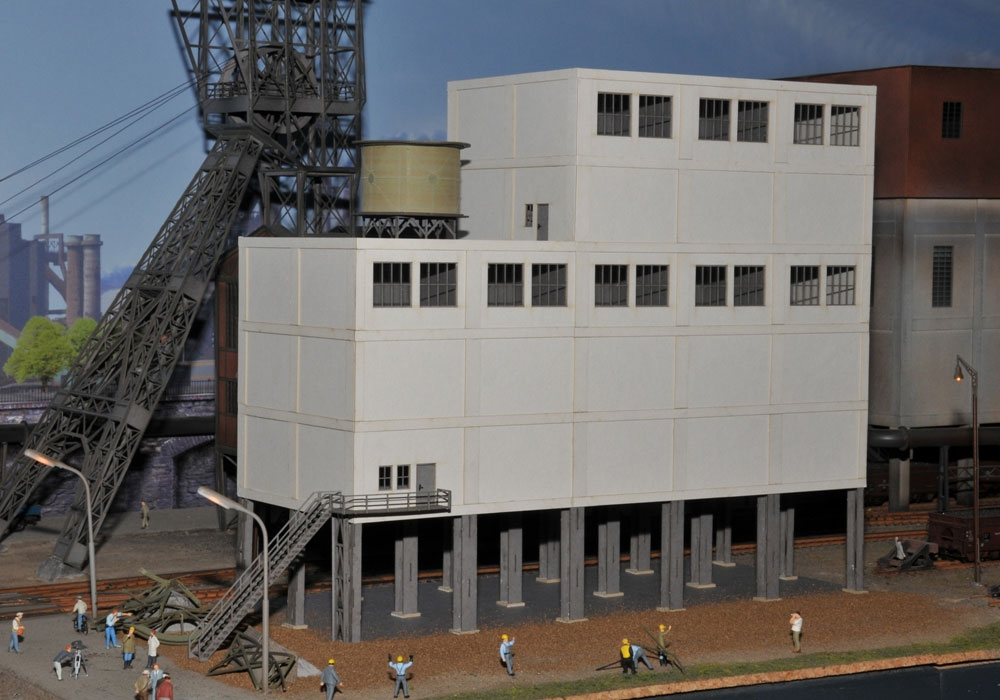 Typische Kohlenwäsche in Betonbauweise, aufgeständert um darunter Gleise verlegen zu können. Hier wurde die Kohle gewaschen und sortiert, bevor sie in Kohlewagen verladen wurde. Der Bausatz ist extra schmal konstruiert, um ihn auch als Hintergrund Kulisse nutzen zu können.