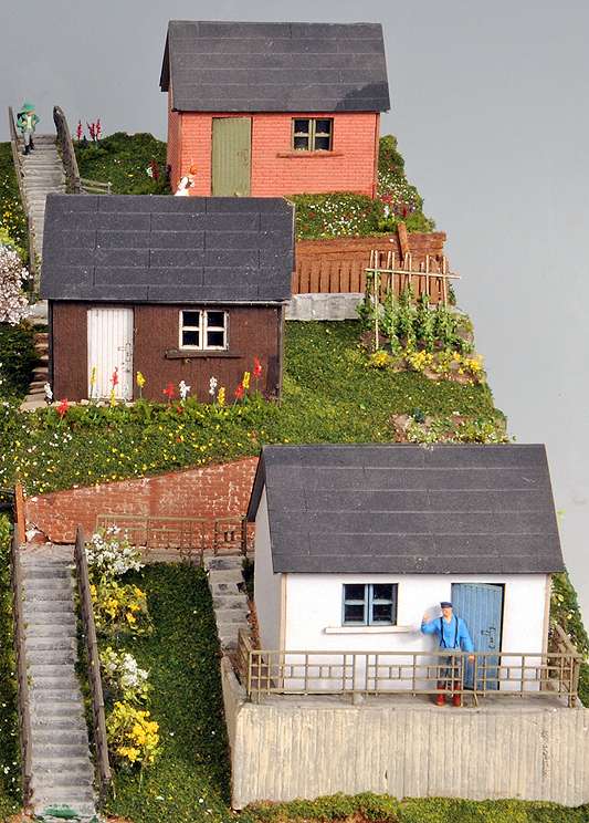 Drei Gartenlauben / Schrebergartenhäuschen, wie sie auch heute noch häufig neben den Gleisen zu finden sind. Spur HO 1:87
