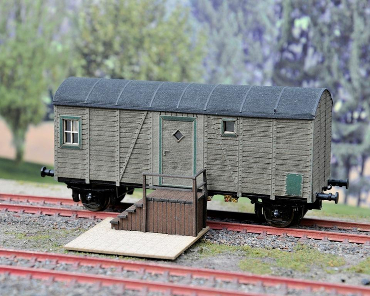 Alter Güterwaggon, umgebaut zur Laube inklusive Terasse und Treppe. Spur HO 1:87