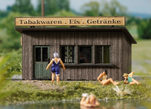 Kleines Holzbüdchen/Verkaufsstand zum Verkauf von Eis, Rauchwaren, Zeitschriften etc.
