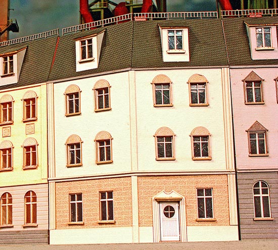 Eckhaus im 30° Winkel, Straßenfront mit Stuckfassade und schlichter Hinterhofseite. Zur Gestaltung geschwungener Straßenzüge.