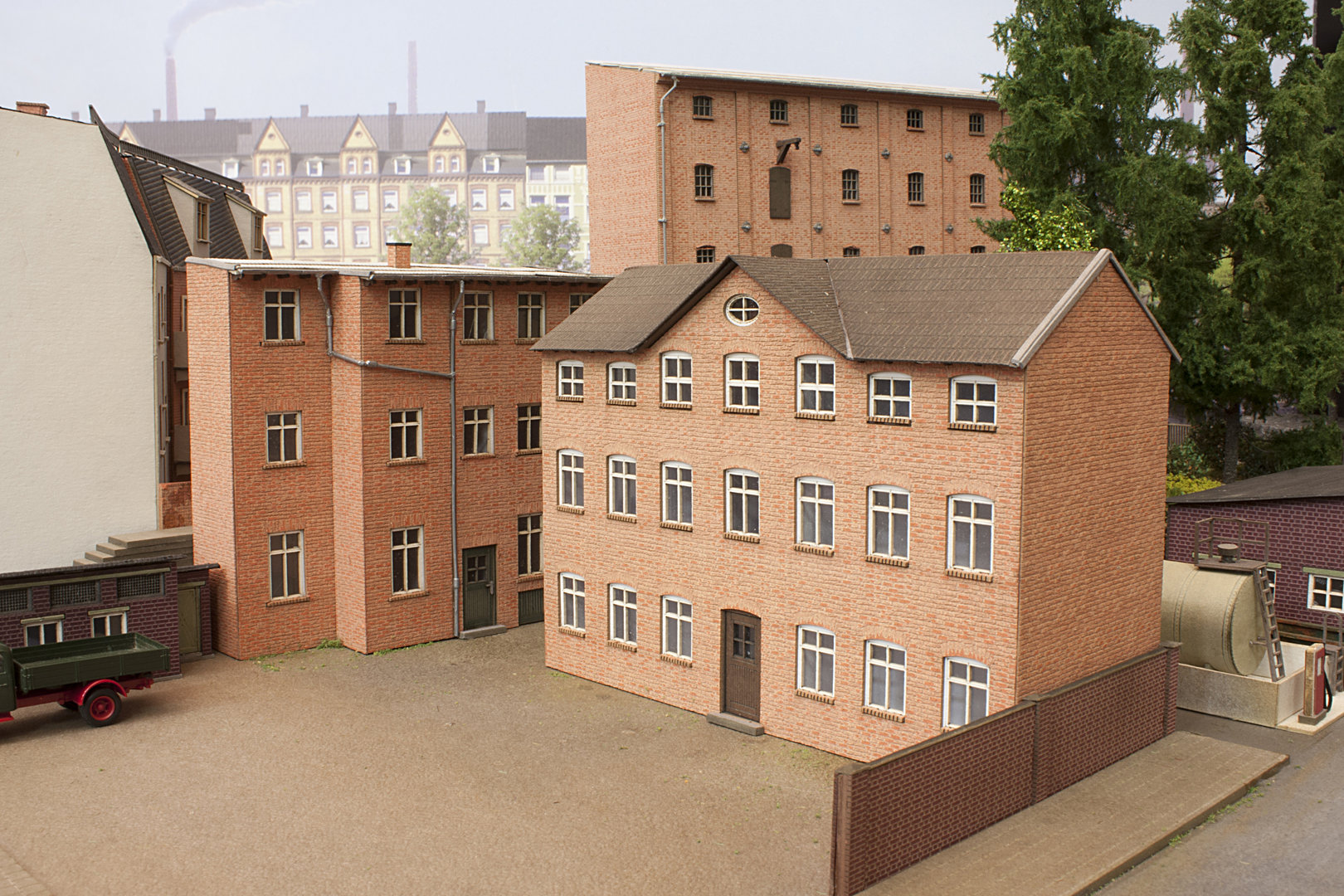 Einfaches Wohnhaus mit 3D-Ziegelwänden, Hinterhofgebäude. Typischerweise nur mit Fenstern auf der Hofseite. Zweite Rückfassade mit Fenstern liegt dem Bausatz bei, damit kann es auch als "normales, einzeln stehendes Wohnhaus gebaut werden. Dach mit Dachsparren.