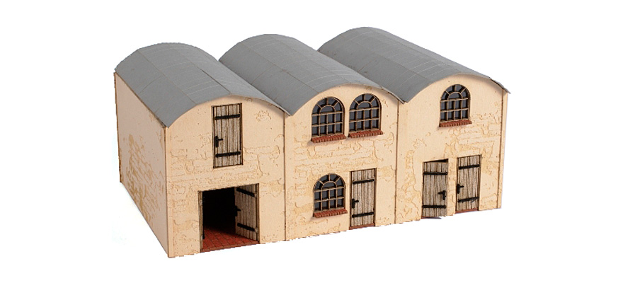 Das Vorbild zu dieser kleinen Werkstatt stand bis in die 2000er Jahre auf dem Gelände der Tuchfabrik "Schürmann und Schröder". Die Hallen können auch einzeln gestellt oder als Halbrelief gebaut werden. Sehr aufwendig gravierte, verhauene Putzfassade.