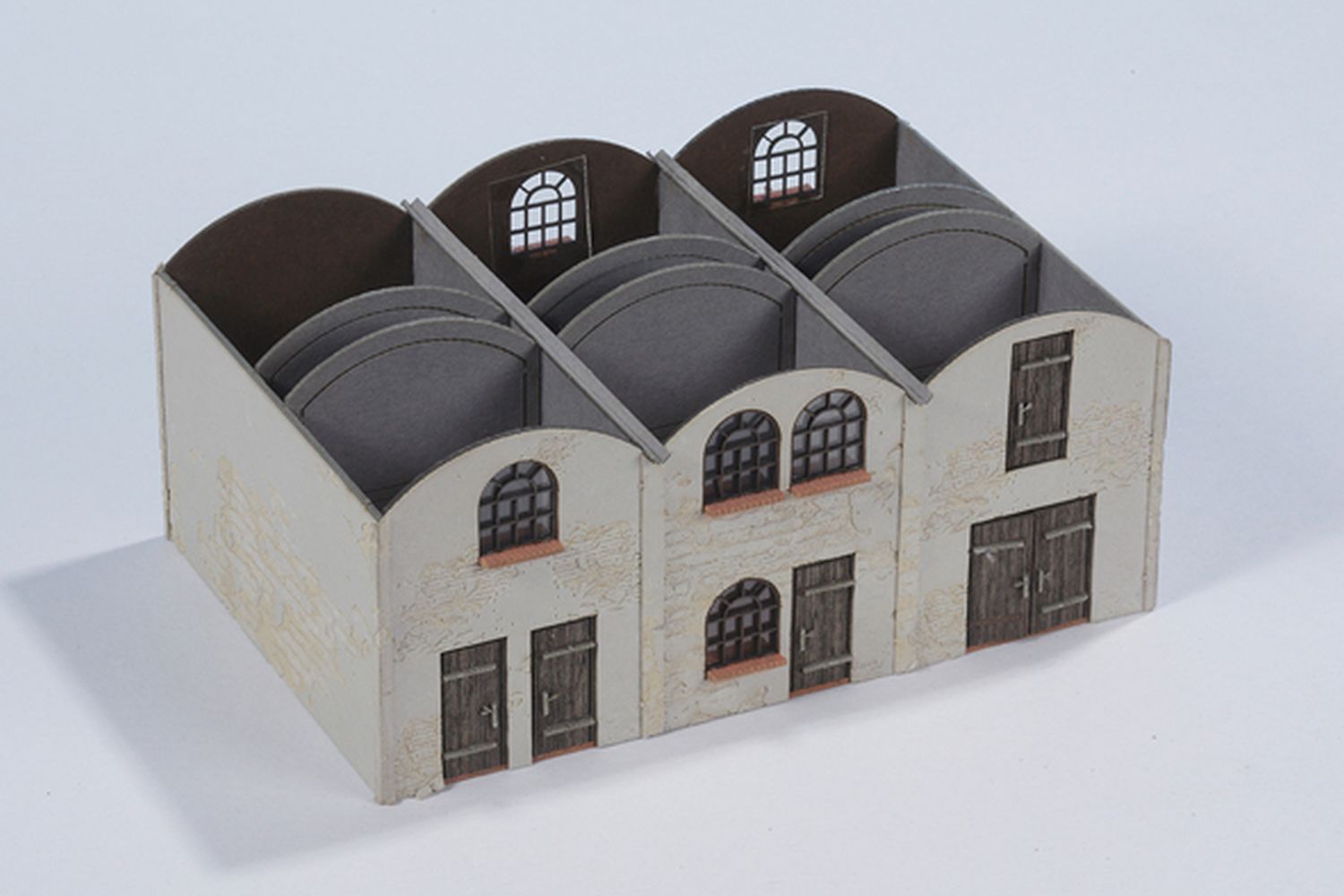 Das Vorbild zu dieser kleinen Werkstatt stand bis in die 2000er Jahre auf dem Gelände der Tuchfabrik "Schürmann und Schröder". Die Hallen können auch einzeln gestellt oder als Halbrelief gebaut werden. Sehr aufwendig gravierte, verhauene Putzfassade.