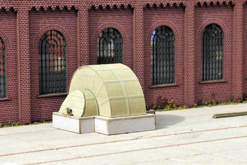 Bausatz H0 (1:87), Maße in mm: Länge 50, Breite 46, Höhe 35. Einzelne Turbine auf einem Betonlager