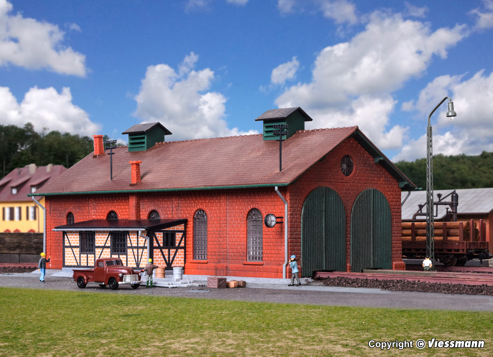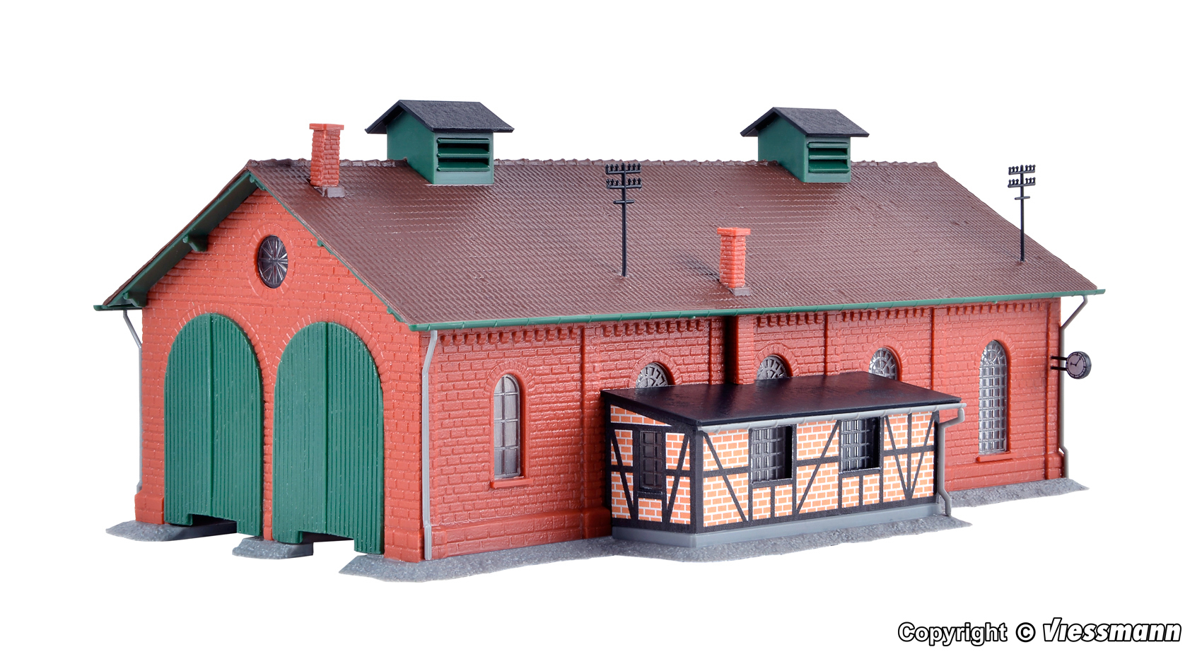Bausatz. Spur N Lokschuppen in Backsteinbauweise mit kleinem Fachwerkanbau. Die Tore sind manuell beweglich. Maße: L 18,5 x B 10,5 x H 7,5 cm. Schwierigkeitsgrad: 2 (Fortgeschrittene).