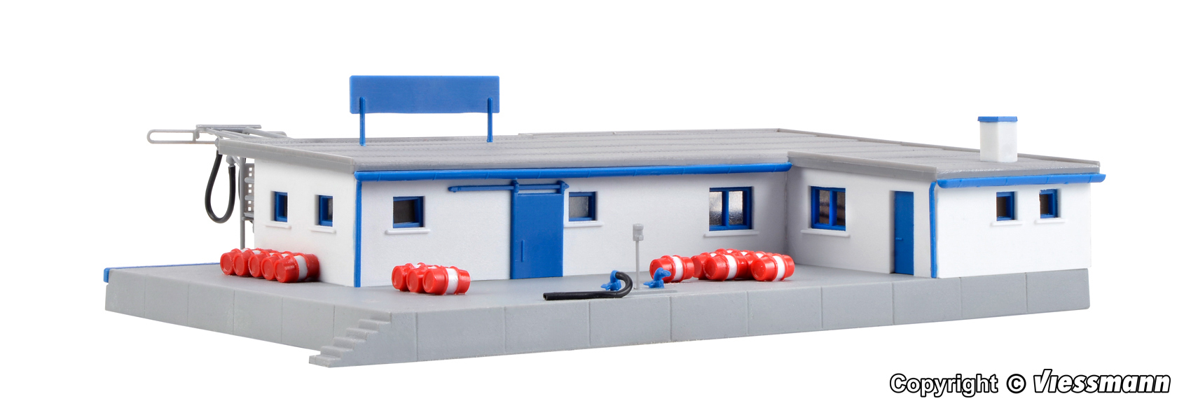 Die MIRO Mineralölanlage von kibri ist so konzipiert, dass sie sich aus einzelnen Bausteinen individuell zusammenstellen lässt. So lassen sich die Anlagenteile problemlos in jede beliebige Modellbahnanlage einpassen. Der angelieferte Treibstoff (z. B. leichtflüchtiges Benzin oder Rohöl) wird zur Zwischenlagerung im Hochtank Art. 37467 gelagert, bevor er an der Abfüllanlage an diesem Bürogebäude in den Tankwagen gefüllt und von dort zu den Verbrauchern transportiert wird. Maße: L 14 x B 9 x H 3,5 cm. Schwierigkeitsgrad: 2 (Fortgeschrittene).