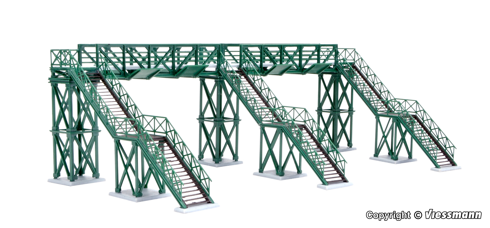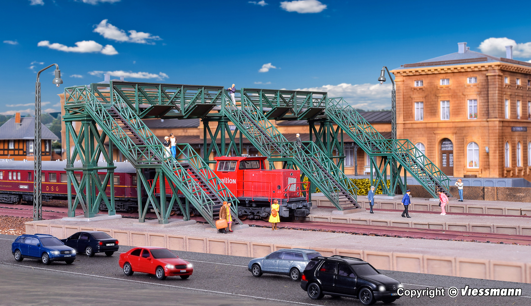 Solche Übergangsstege verbinden elegant die Bahnsteigpodeste und führen die Fahrgäste sicher über die gefährlichen Gleise der Bahnhofsanlagen. Die Treppenaufgänge sind in verschiedenen Varianten aufbaubar. Durchfahrtshöhe: 4,5 cm. Durchfahrtsbreite: 6,7 cm. Maße: L 18 x B 8,5 x H 6 cm. Schwierigkeitsgrad: 2 (Fortgeschrittene).