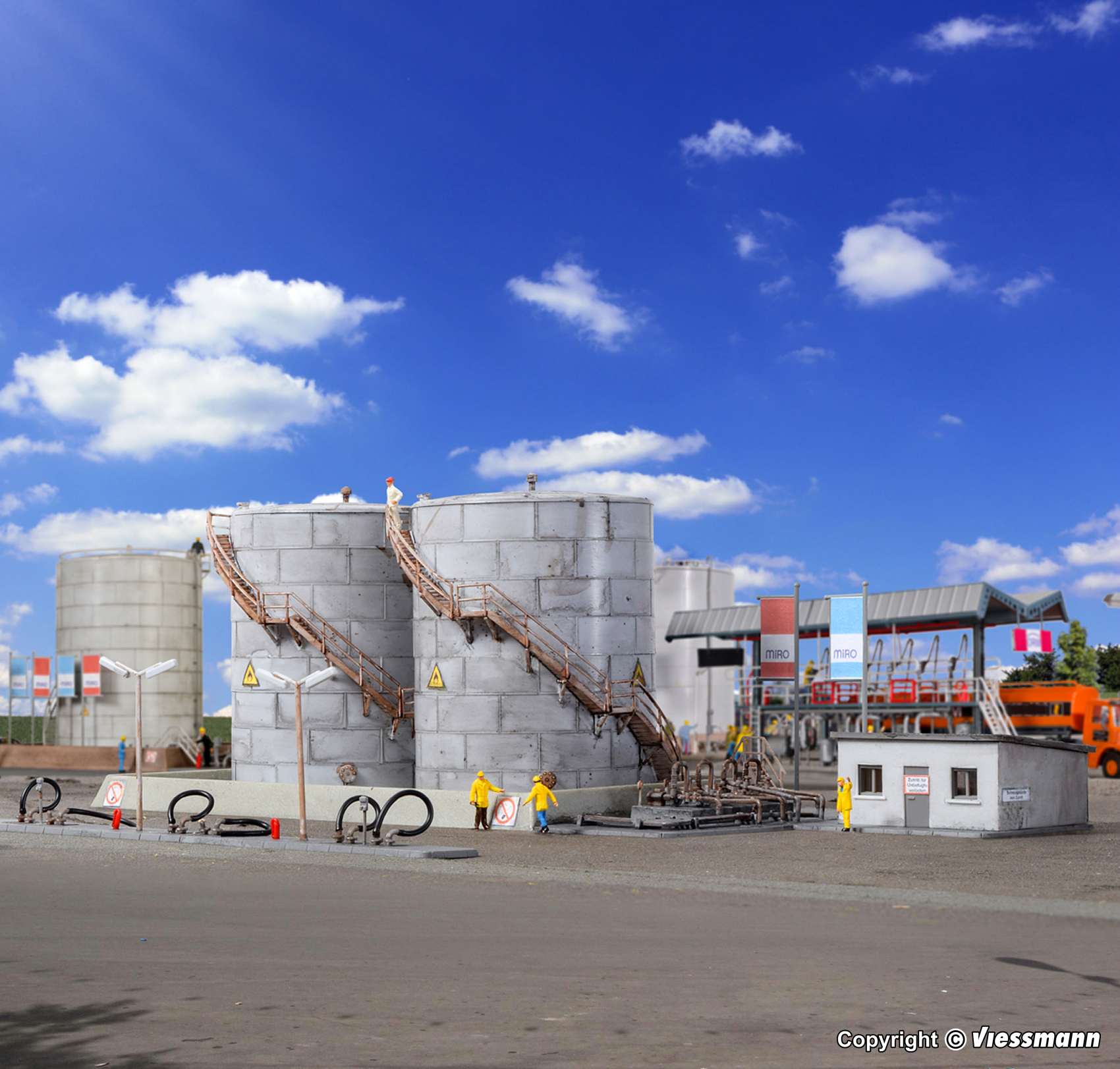 Die MIRO Mineralölanlage von kibri ist so konzipiert, dass sie sich aus einzelnen Bausteinen individuell zusammenstellen lässt. So lassen sich die Anlagenteile problemlos in jede beliebige Modellbahnanlage einpassen. Der angelieferte Treibstoff (z. B. leichtflüchtiges Benzin oder Rohöl) wird zur Zwischenlagerung in diesen Hochtanks gelagert, bevor er an der Abfüllanlage am Bürogebäude Art. 37469 in den Tankwagen gefüllt und von dort zu den Verbrauchern transportiert wird. Wie beim Vorbild stehen die Tanks auf einer undurchlässigen Lehmschicht und sind zum Schutz des Erdreichs von betonierten Wällen umgeben. Maße: Hochtanks mit Bürogebäude L 22,5 x B 8,5 x H 8 cm, Abfüllstation L 14,3 x B 1,5 x H 3,5 cm. Schwierigkeitsgrad: 2 (Fortgeschrittene).