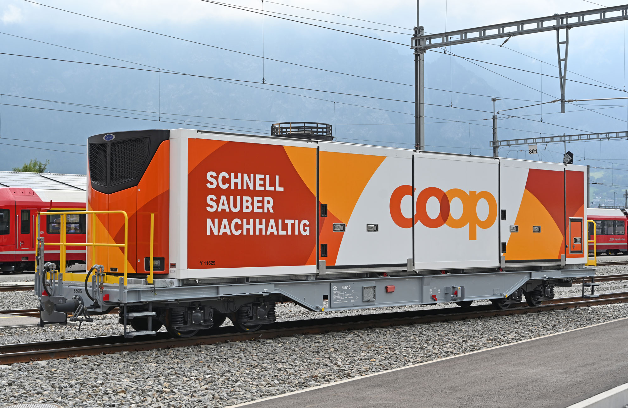 Die Coop Genossenschaft hat die Lokwerbung der seit 1999 für eines der größten Detailhandels- und Großhandelsunternehmen in der Schweiz werbenden Ge 4/4 III 641 zum vierten Mal angepasst: sie wurde kurz vor Ostern im Stile der bereits auf Schweizer Normalspurgleisen verkehrenden Loks des Typs Stadler Euro 9000 bzw. Siemens Vectron unter Verwendung der drei Logofarben gestaltet. Bereits seit Sommer 2025 trägt der Klimacontainer Y 11629 dieses auffallende Design. Er wurde nach dem Umbau des Schiebewandwagens Haiqq-tyz 5164 auf den daraus entstandenen Tragwagen Sb 65615 geladen.
