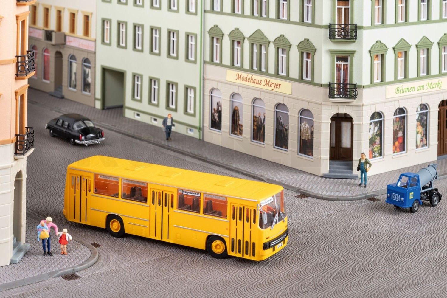 Bausatz. Fein detaillierte und akkurat bedruckte Modellnachbildung des dreitürigen Stadtomnibus „260“ des ungarischen Herstellers Ikarus. Bündige einzusetzende Scheiben sowie einzeln zu montierende transparente Leuchten, vorbildgerechte Bereifung und Rollfähigkeit zeichnen das Fahrzeug aus. Eingelenkt darstellbare Vorderräder sowie eine zum Selbstbemalen beiliegende Fahrerfigur für die Gestaltung realistischer Szenen.