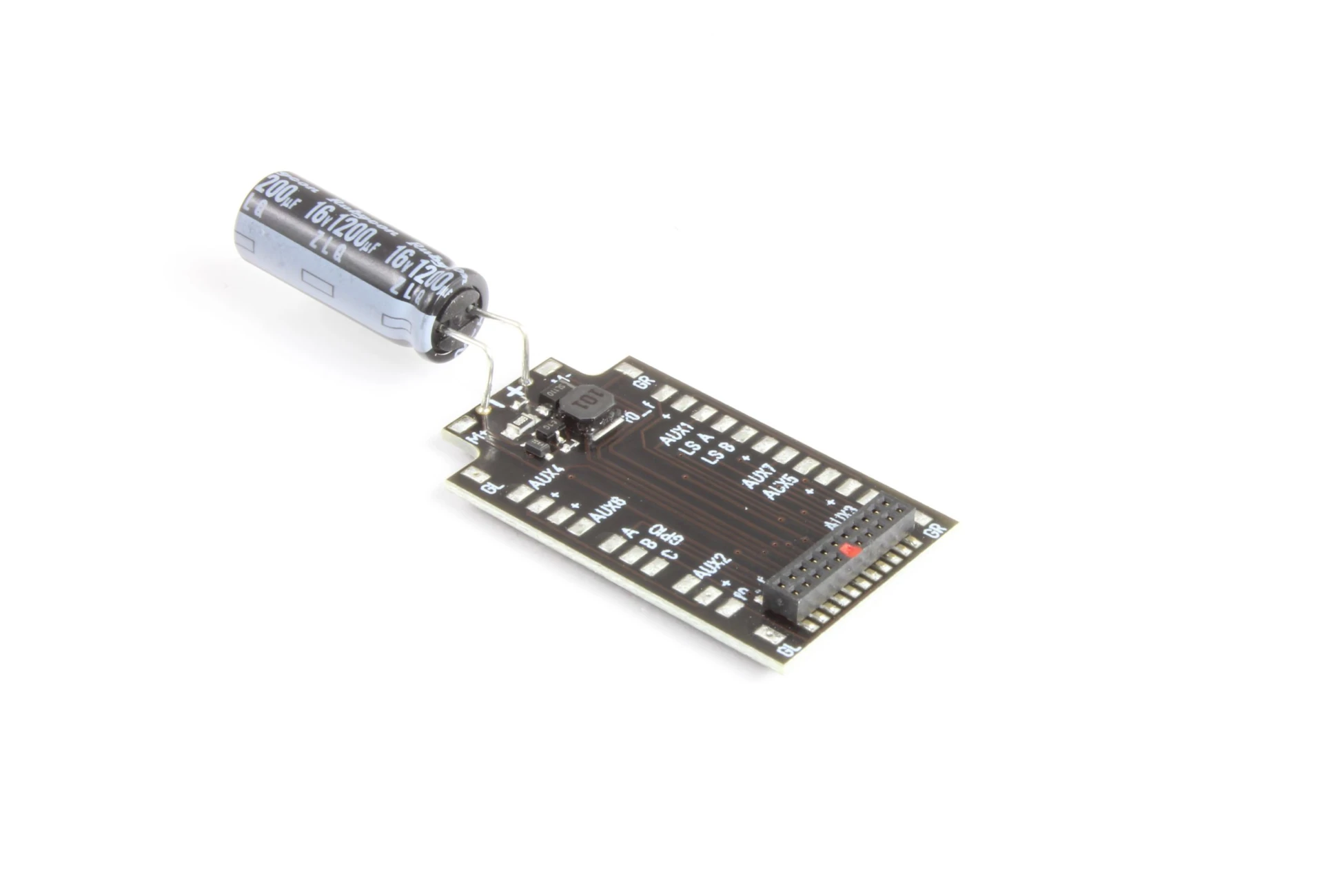 Kondensator 1.200uF bereits angelötet. Position passend für Gützold-Loks 3103938x und 3103939x mit Ausschnitt für Kondensator neben der Leiterplatte.