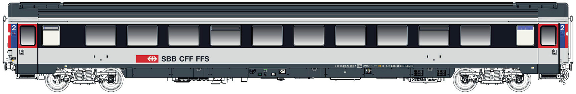Hoch detailliertes Gleichstrom Modell mit Inneneinrichtung. Kupplungsaufnahme nach NEM 362 mit KK-Kinematik. Lackierung: grau/weiß/rot, kurzer roter Streifen, IC Fahrrad Logo, neues SBB Logo.