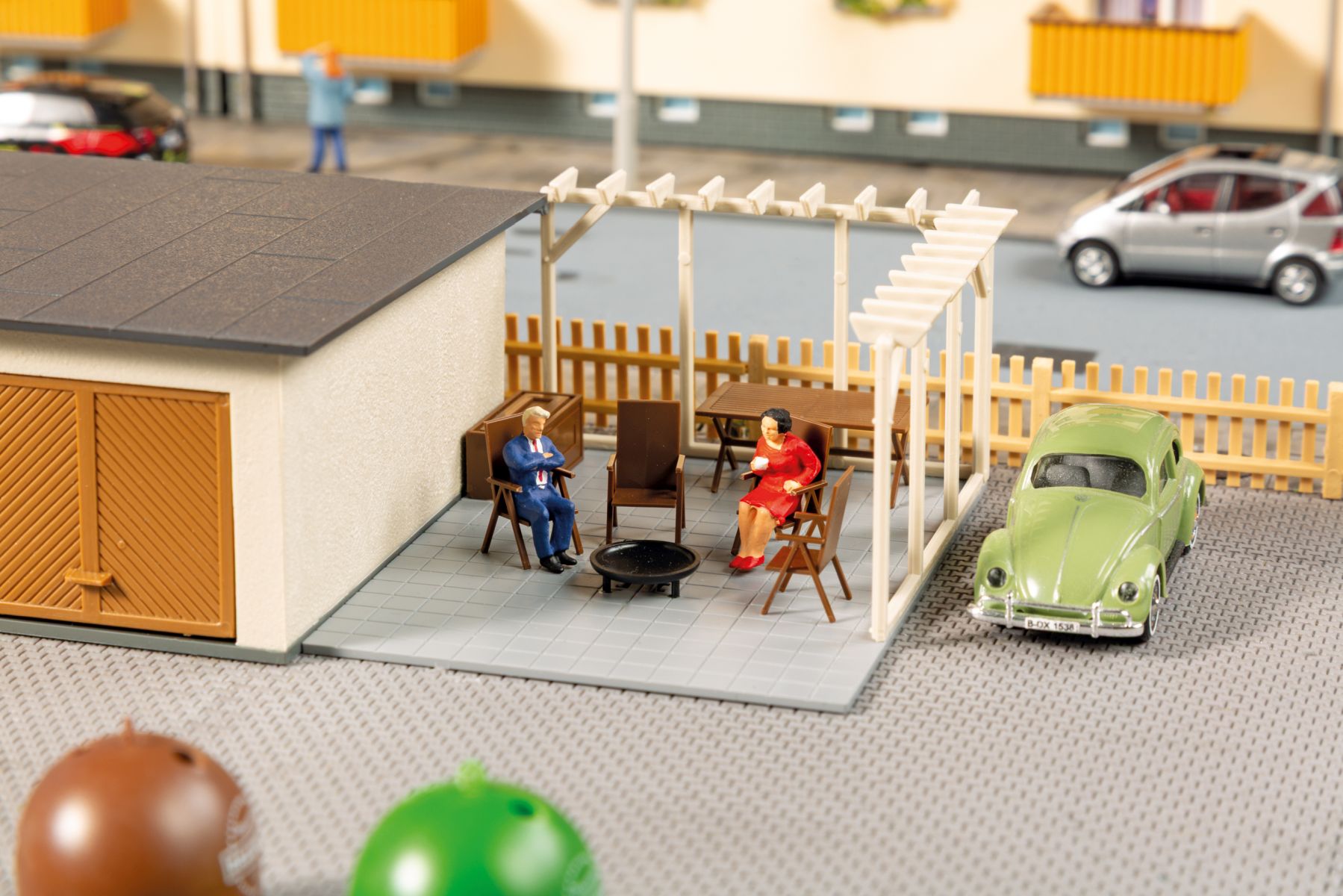 Bausatz umfasst sechs Garagen, die sich als Reihe oder leicht versetzt aufstellen lassen. Mehrfarbig ausgeführte Tore sorgen für Abwechslung.