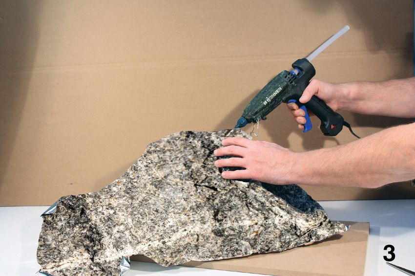 3 - Knitterfelsfolie über die Unterkonstruktion drappieren und mit Heißkleber befestigen.