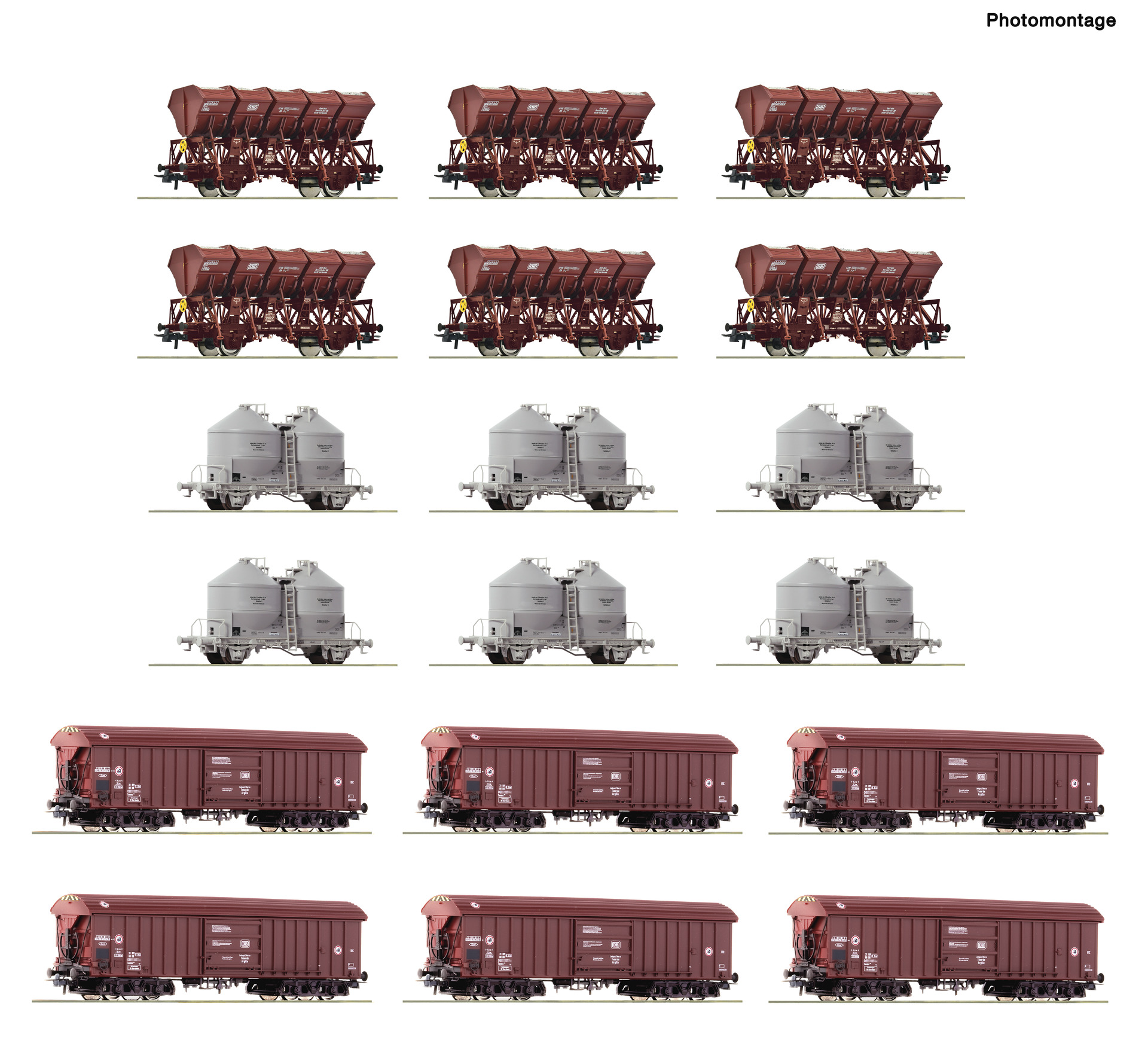 Bestehend aus sechs Muldenkippwagen, Gattung F-z 120, sechs 2-achsigen Silowagen, Gattung Ucs 909 und sechs Tonerdewagen, Gattung Taems. Wagen im Einzelverkauf je Gattung mit 1 Betriebsnummer versehen