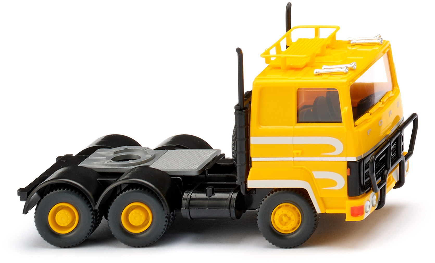 Ford Transcontinental im Adventure-Look Dieses WIKING-Modell zeigt den Ford Transcontinental erstmals in einem Adventure-Look – eine gelungene Premiere! Passend dazu schmückten die Traditionsmodellbauer die einst eher unscheinbare Zugmaschine mit allerlei Exterieur – der Transcontinental erhält dank des Super-Finishings so seine optische Kraft. Zu den Accessoires gehören der vordere Kuhfänger, opulente Auspuffrohre und ein typischer Dachgepäckträger. Hinzu kommt eine auffällige Gestaltung mit umfangreicher Zierstreifenbedruckung. Last but not least spendiert WIKING der Sattelzugmaschine aufwertende Renntruck-Felgen. Fahrerhausober- und -unterteil rapsgelb. Kühlergrill, Fahrgestell mit Kardanteil schwarz, Felgen sowie Dachgepäckträger rapsgelb. Inneneinrichtung mit Lenkrad schwarz. Rammschutz sowie Auspuffrohre schwarz, Fanfare silber. Frontscheinwerfer gesilbert, Rückleuchten rot. Blinker verkehrsorange. Frontseitig silberner Ford-Schriftzug sowie umlaufender silberner Streifen. Frontseitig und seitlich geschwungener, lichtgrauer Zierstreifen.